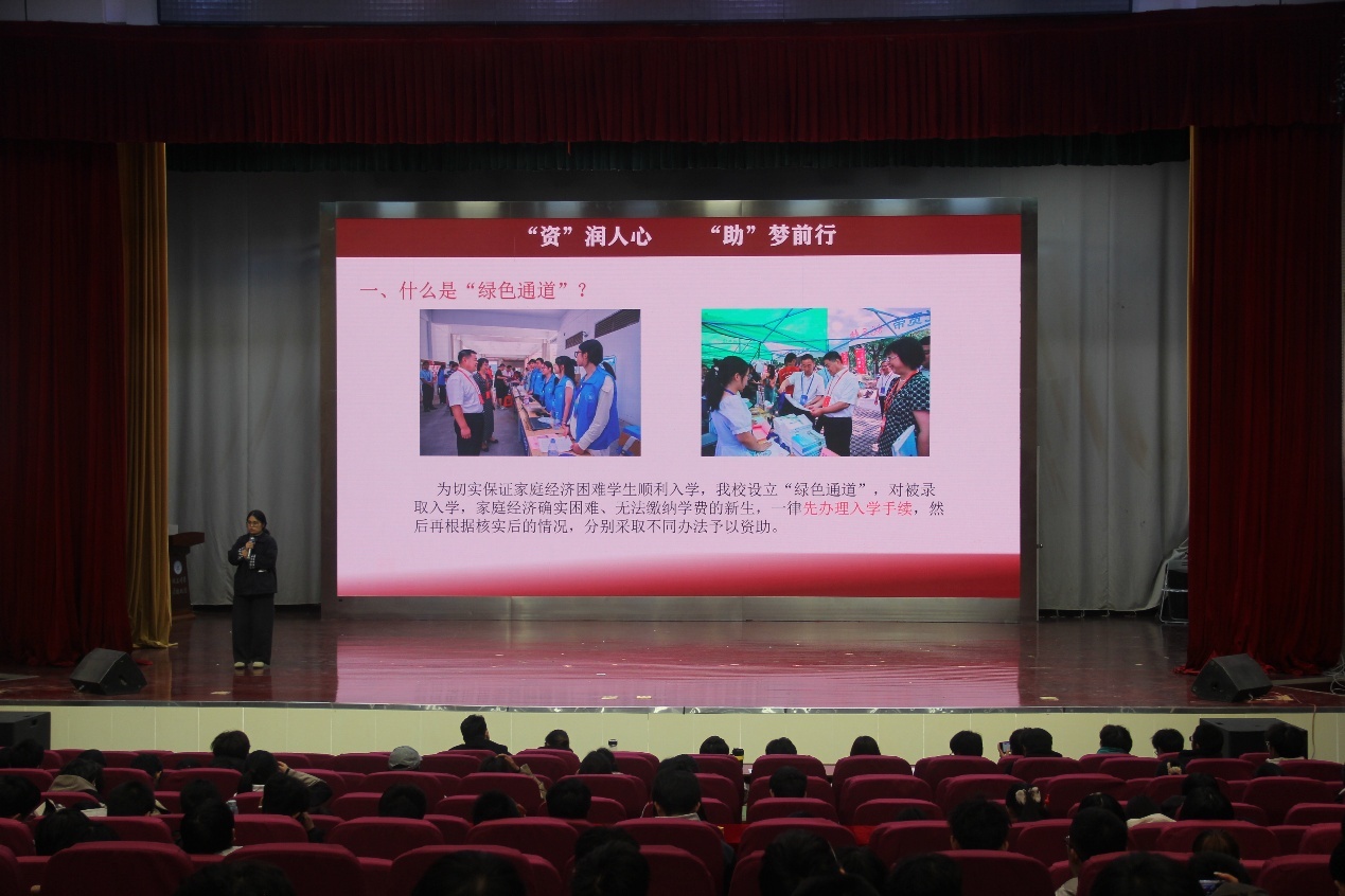 资助联系人王小花主讲,25级辅导员周文潇、2025级全体新生参加活动。